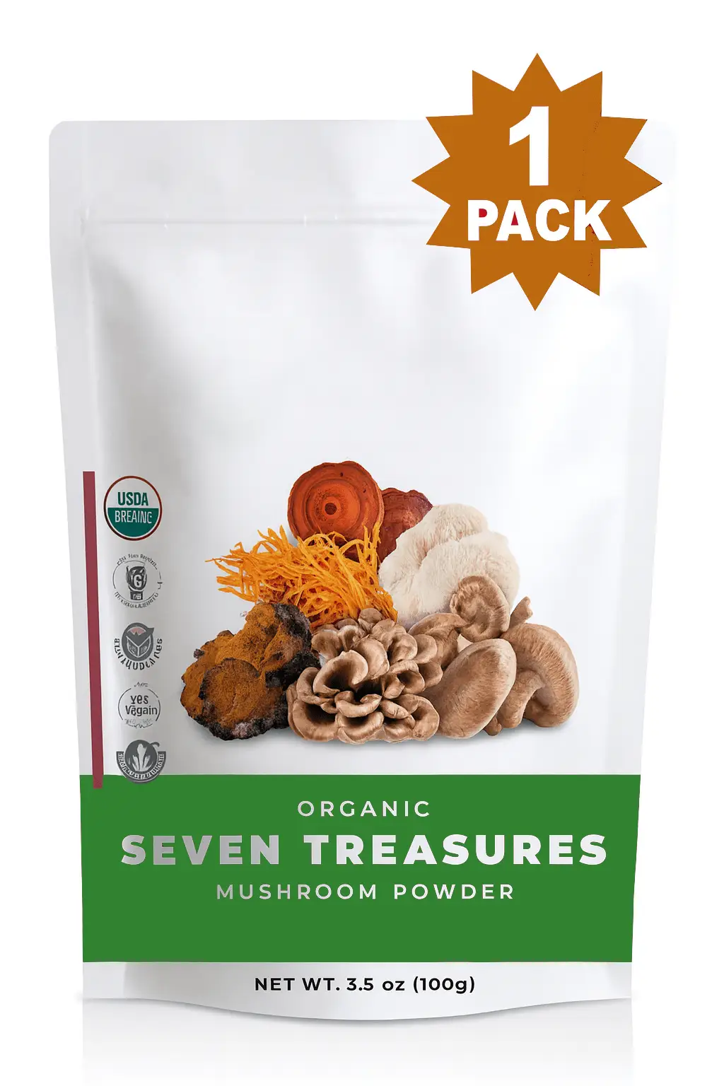Ingredients: Organic Reishi Powder, Organic Shiitake Powder, Organic Cordyceps Powder, Organic Turkey Tail Powder, Organic Maitake Powder, Organic Chaga Powder, Organic Lion’s Mane Powder